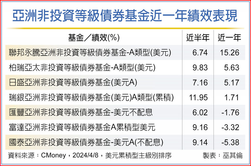 台新新興短期非投資等級債券基金經理人張瑋芝表示,美國上修美國經濟成長至2.1%,美國經濟強勁,得以支撐新興市場企業債表現,惟通膨路徑與美國降息不確定性,將使非投資等級表現優於投資等級。亞洲非投資等級債受惠大陸經濟回溫、貨幣政策作多,後市具表現空間。