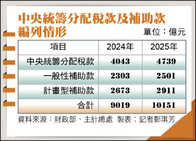 中央政府對地方財源挹注,除中央統籌分配稅款外,還有一般性補助款及計畫型補助款。根據財政部資料,二○二五年度編列中央統籌分配稅款四七三九億元,包括普通統籌分配稅款(含金融營業稅短少補助)四四六一億元及特別統籌分配稅款二七八億元,較二○二四年增加約六九六億元。