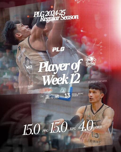 謝宗融上週對鋼鐵人繳出15分、15籃板的PLG代表作,還成為聯盟史上第5位單場「雙15」的非外籍球員。