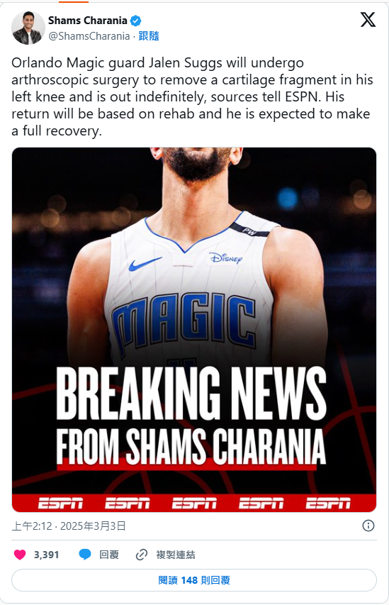 奧蘭多魔術隊季後賽競爭進入關鍵時刻,卻再次遭受重創,主控薩格斯(Jalen Suggs)將接受左膝關節鏡手術,藉此移除軟骨碎片,目前尚無明確的復出時間表,意味著賽季將提前宣告報銷。