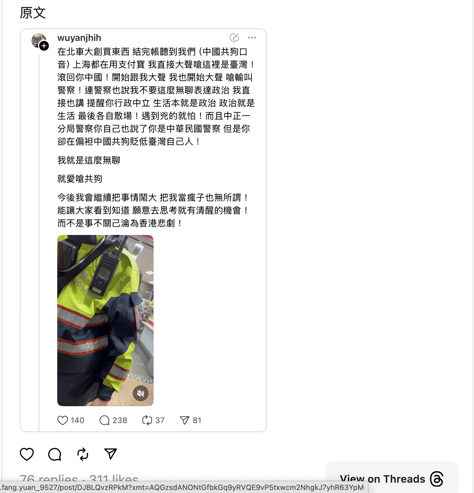 據了解,事件起因是一名陸客提及「上海都在用支付寶」,導致現場青鳥不滿,當場怒嗆「這裡是台灣!」並辱罵對方為「共狗」,要求其離境,隨後,警方趕抵現場後試圖安撫雙方情緒,卻遭青鳥批評未明確譴責陸客,進而將矛頭轉向警方,指責其應「行政中立」。