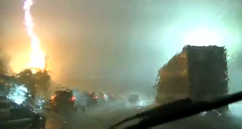 美國南卡羅來納州芒特普萊森特(Mount Pleasant)驚現罕見景象,一道雷電擊中公路電線,不僅在空中瞬間引發巨大火球,另一端電線還閃出詭譎藍光,震撼畫面瞬間在網路瘋傳。