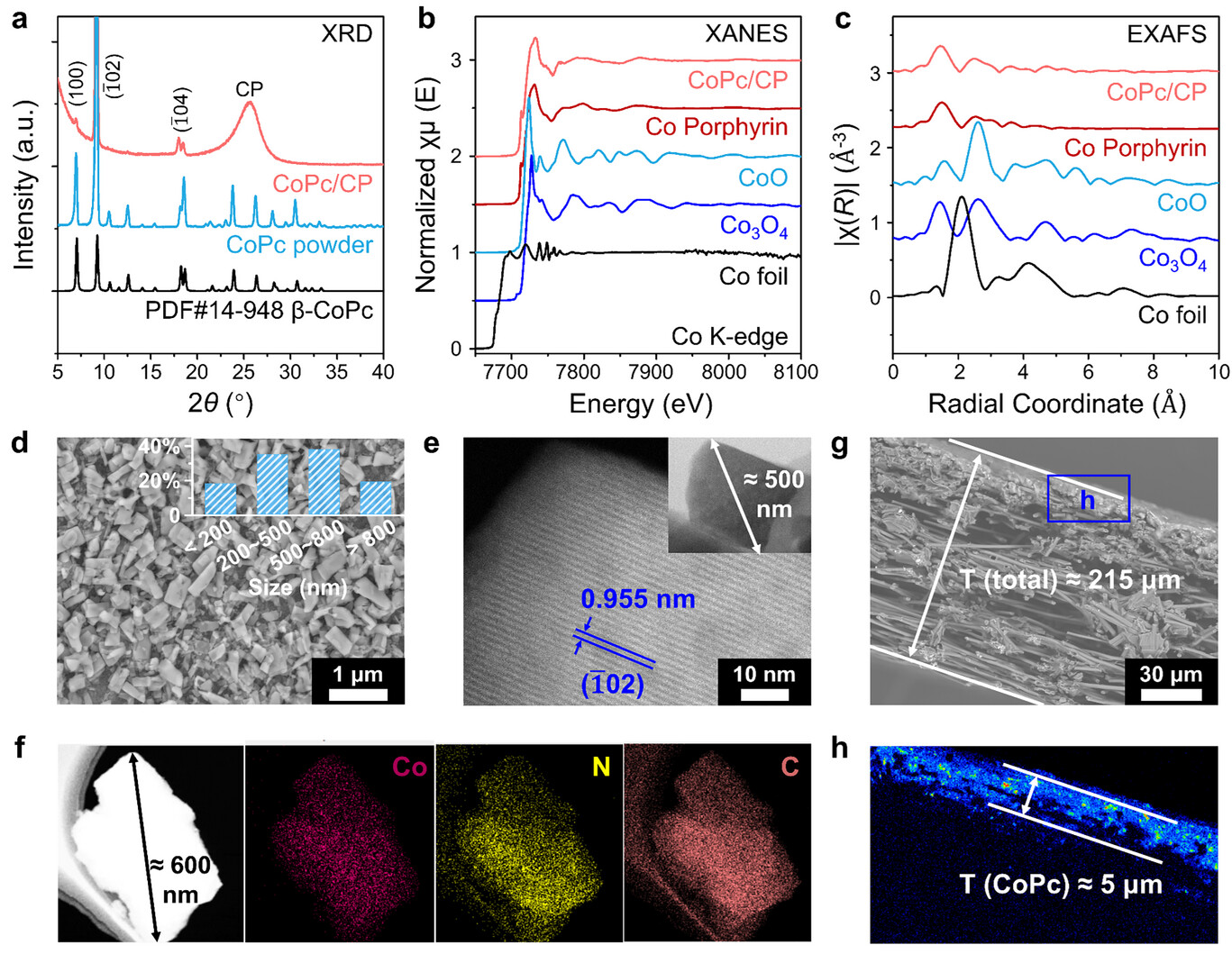這組圖展示了噴塗製成的 CoPc 電極具備穩定的晶體結構、元素分佈均勻,且活性層厚約 5 微米,整體厚度約 215 微米,適合用作電化學應用。(圖/《先進科學》)