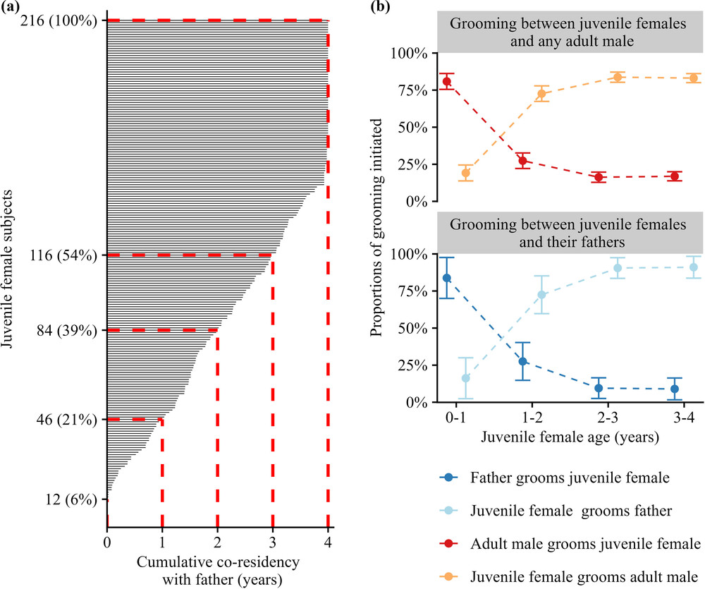 圖說明了母狒狒從小到大與父親共居的年數分布,以及母狒狒和父親、其他成年雄性之間互相理毛(grooming)主動性的變化。