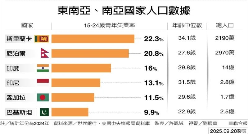 龐大年輕人口應是推動經濟的強大引擎,卻在東南亞與南亞逐漸淪為「失業陷阱」。印尼及尼泊爾接連爆發青年示威抗議,對執政者形成威脅。這些年輕人用智慧手機和社群,點燃了被外界形容繼阿拉伯之春的「亞洲之春」。