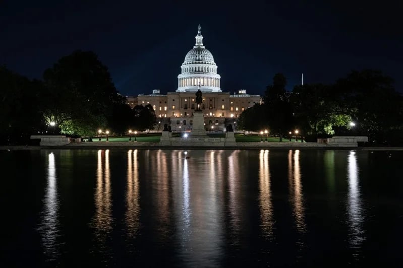 美國華府的國會山莊9月30日在聯邦政府關門生效前數小時燈火通明。法新社