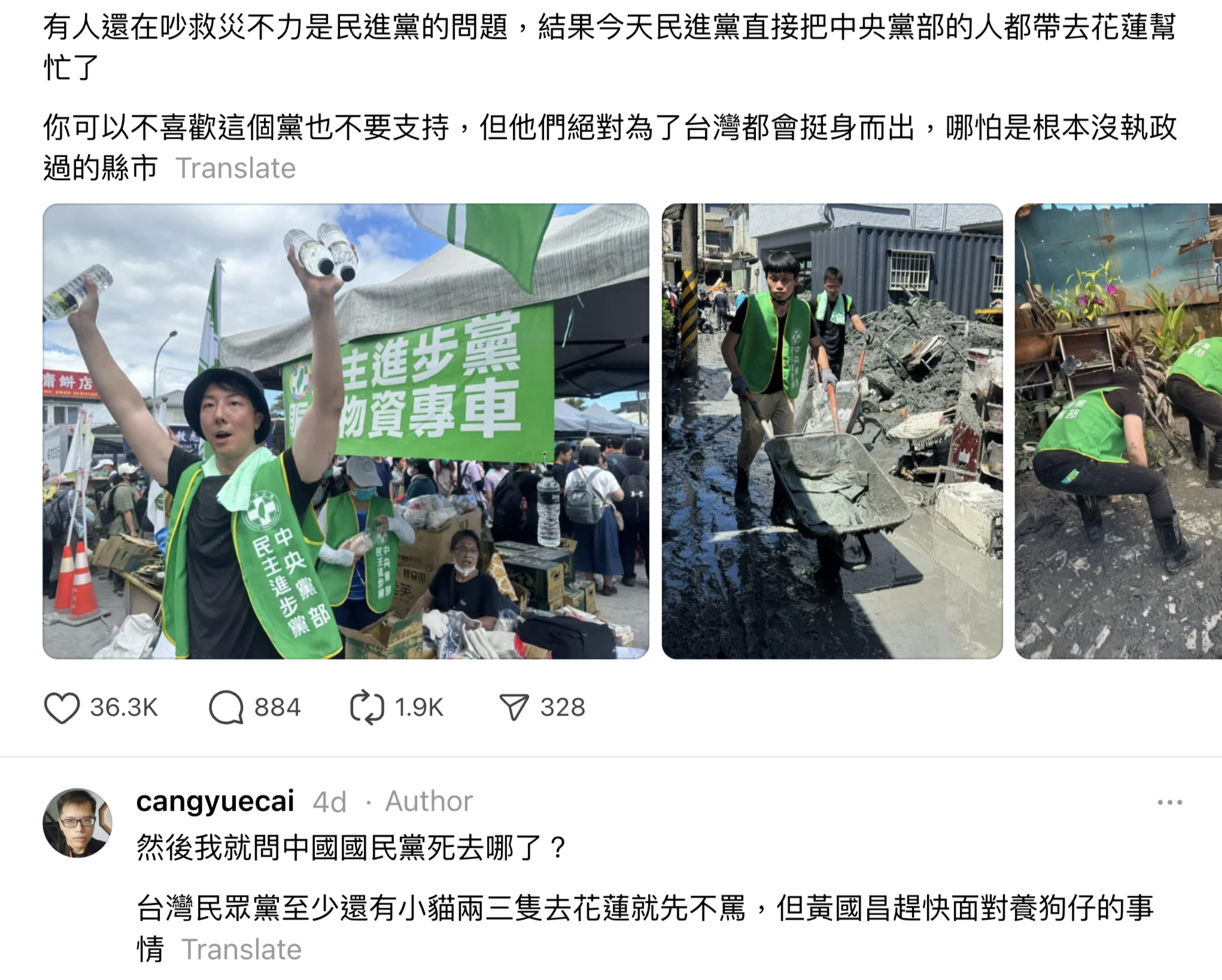 花蓮政治板塊藍大於綠,過去民進黨選輸花蓮市長補選,前綠委段宜康發文「鄙視選民」;花蓮強震,民進黨立院黨團總召柯建銘脫口「老天有眼」;大罷免,傅崐萁更是首要指標。卓榮泰勘災與傅崐萁從街頭吵到指揮所,最後拂袖而去,可謂其來有自,心結已深。但精誠所至,金石為開,花蓮並非綠營沙漠;副總統蕭美琴就曾繼承黃信介「元帥東征」精神,成功翻轉花蓮。災民無辜,救災不分顏色,難道滿街鏟子超人不能提供一點啟示嗎?