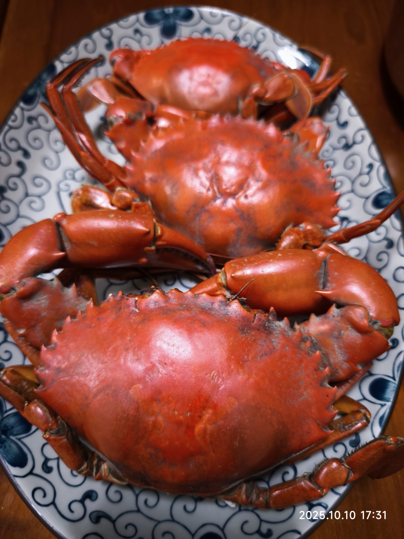 螃蟹是野生的, 殼厚且堅硬, 鄰居抓來送給岳母, 不過最後我實在沒有肚子吃了, 只好讓我們打包帶回