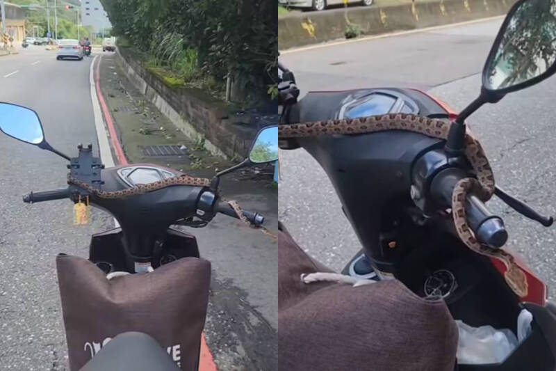 騎機車除了得注意車流與路況,竟還得提防「天降驚嚇」!一名網友近日分享驚魂畫面,表示朋友行經樹蔭時,一條疑似龜殼花的毒蛇竟從天而降,直接掉在機車龍頭上盤踞不去,引發網友熱議。