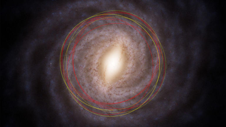 3I/亞特拉斯彗星(紅色軌跡)正環繞銀河系中心運行,就如同我們的太陽(黃色軌跡)一樣。