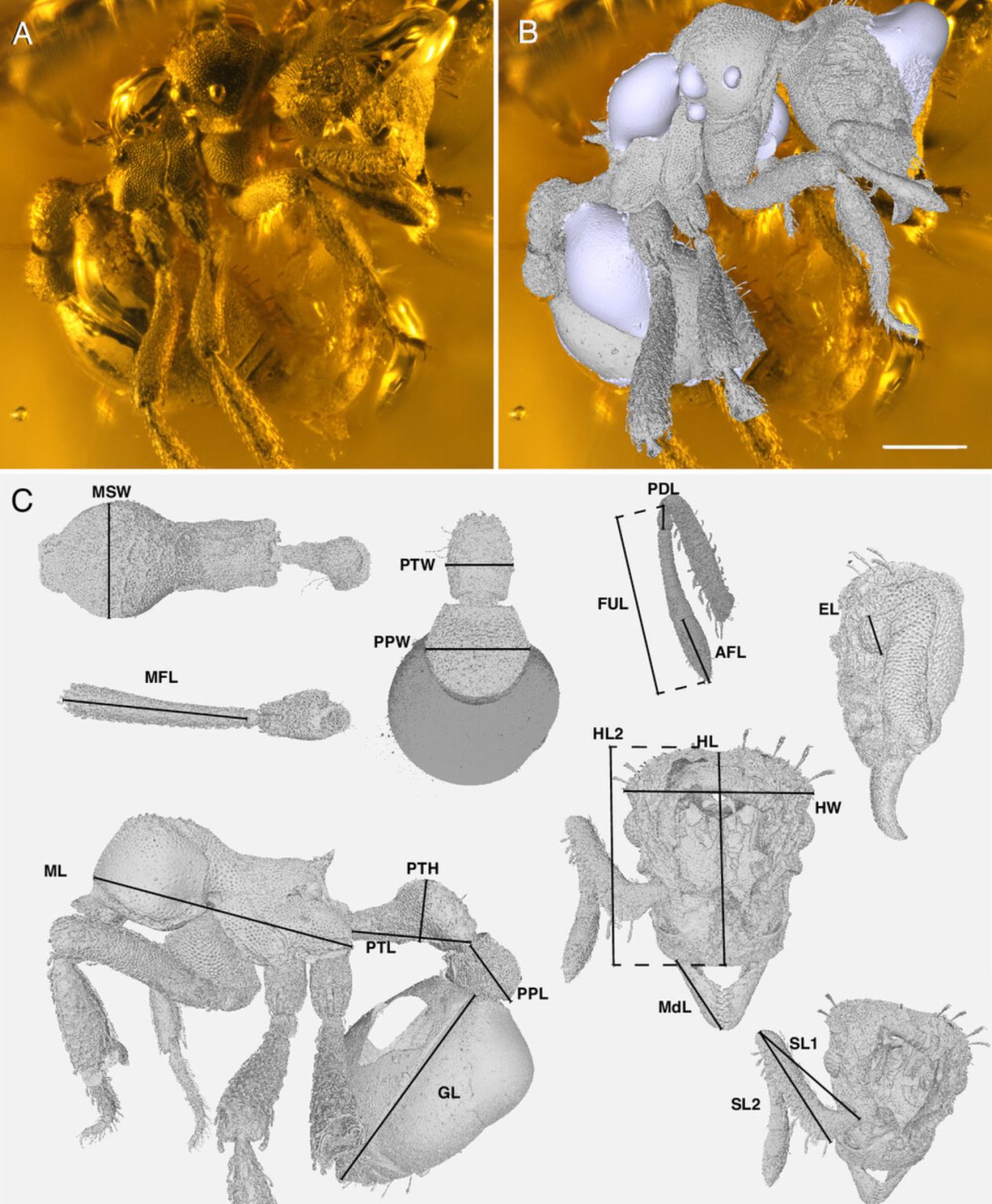 A 圖是該螞蟻保存在多明尼加琥珀中的實體照片。