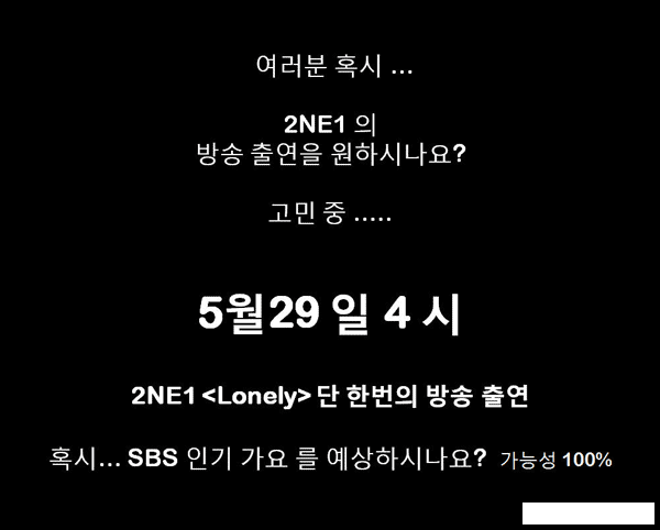 經紀公司YG Entertainment方面19日通過Blog表示:“5月29日下午4時2NE1將進行僅一次《Lonely》的放送出演。”