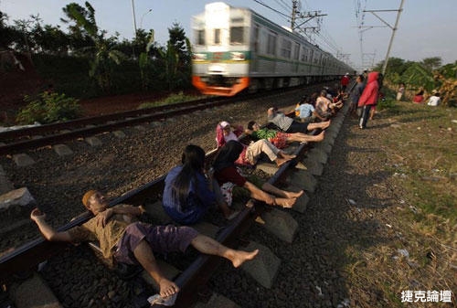 呵呵,事情是這樣的∼在印尼的一個小鎮Rawa Buaya有一群人可能真的沒錢治病,但他們不知道哪來的偏方認為透過臥軌,等火車接近時會產生電流而就是所謂的電療效果,所以就變成大人帶小孩,朋友相約一起去臥軌的現象。聽說是有一位即將癱瘓的病人,在決定臥軌結束生命之時,非但沒死還因為”被電”而治癒了。