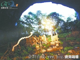 貴州都勻一攝影師在龍�縣果�棺材洞創作拍攝時,偶然拍攝到從棺材�射出的一束光,這束光呈螺旋脊椎狀,猶如一條飛天蜈蚣。當地群眾說從來沒見過這一現象,物理老師也解釋不了,盼望有關專家能揭開這一謎團。