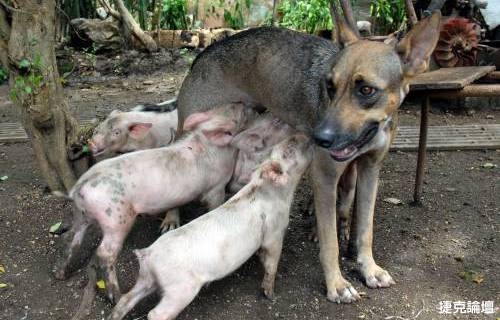 古巴一處農場近日出現一個有趣的畫面,5 隻小豬不吸母豬的奶,反而爭相吸一隻流浪狗的奶水。