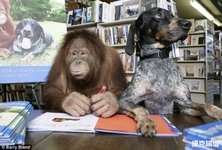 紅毛猩猩「蘇利亞」和獵犬「羅斯可」自從4年前在美國南卡羅萊納州的瀕危動物保育園區相識後,立即結為好友,形影不離。牠們日前一起出了圖文書《蘇利亞與羅斯可》(Suryia and Roscoe),還特別在南卡州喬治城一家書店舉辦簽書會為粉絲們簽名,有模有樣地提筆拍照,並煞有介事地欣賞彼此在書中的英姿。(每日郵報)