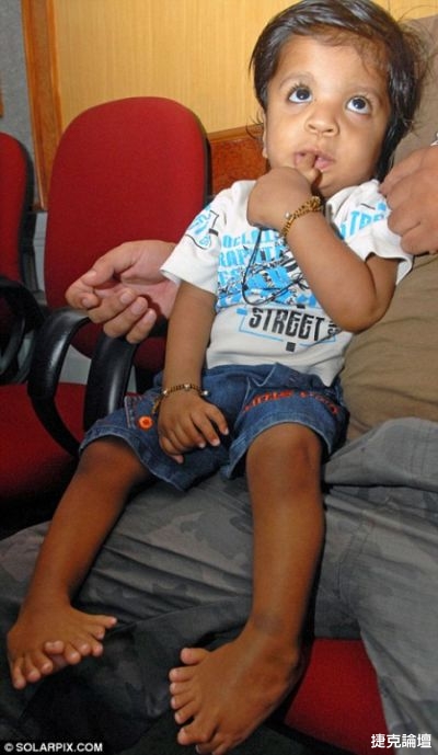 印度北方省1歲男童沙克謝納 (Akshat Saxena),罹患多指畸形症,天生左右手各有7根指頭,左右腳各有10隻腳趾頭,一共有34根指 (趾) 頭,取代中國遼寧有31根指 (趾) 頭的男孩,成為金氏世界紀錄全世界最多指 (趾) 頭的人。不過,沙克謝納雖然有這麼多手指頭,卻沒有大拇指,醫師將為他開刀摘除多餘的手指頭,並替他打造大拇指。(每日郵報)