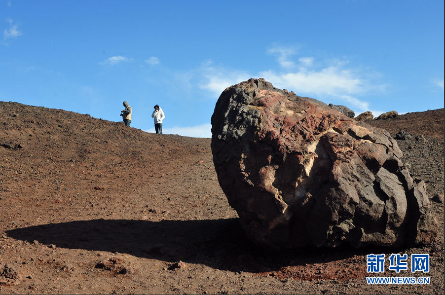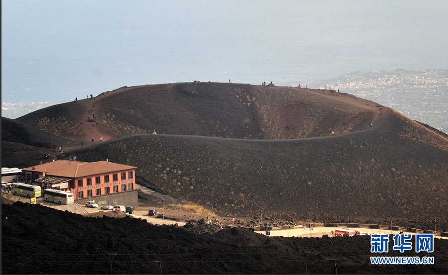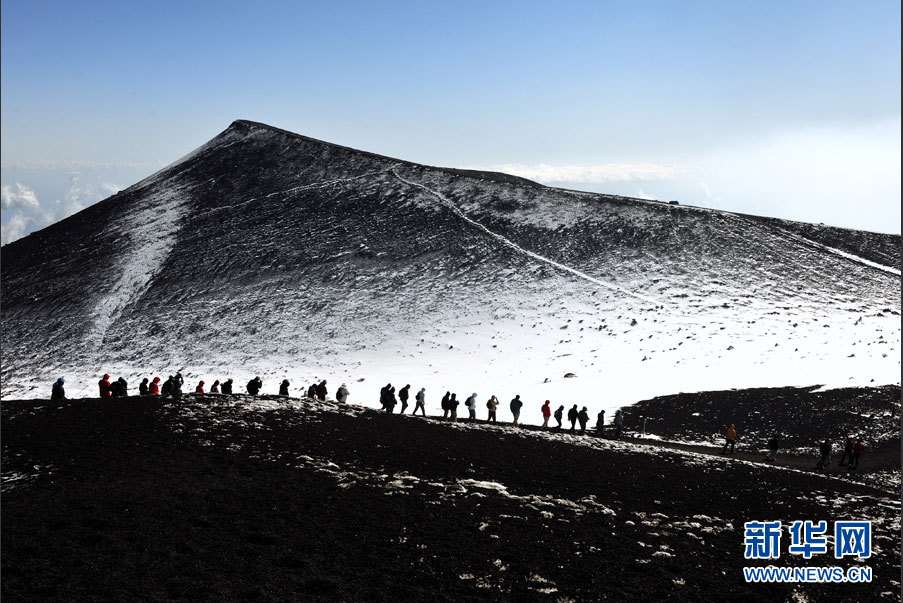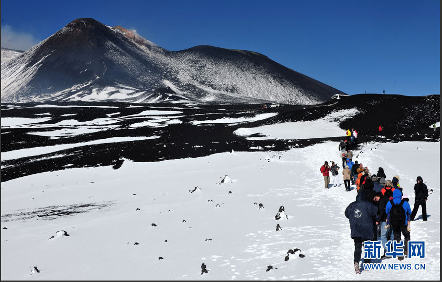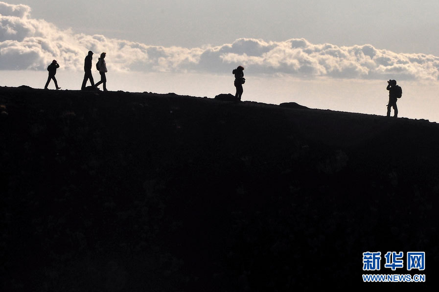 埃特纳是世界上最活跃的火山之一,几乎一直处于活跃状态。其喷发史可追溯至公元前,迄今已喷发过数百次,最近一次大规模喷发发生于2002年。图为游客在埃特纳火山南坡上的一处喷发口游玩。