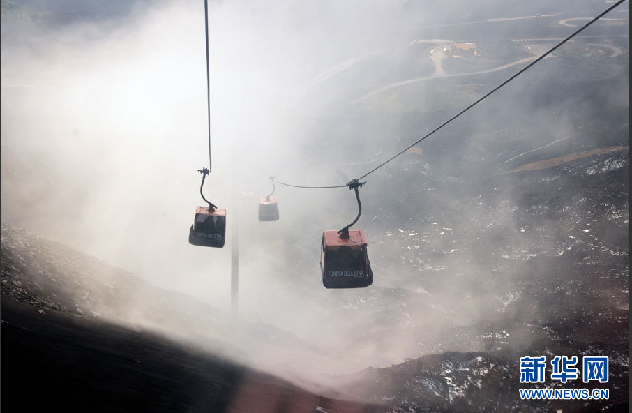 尽管埃特纳火山威胁巨大,但喷发出的火山灰形成了肥沃的土壤,为农业生产提供了极为有利的条件,附近地区人口稠密、经济兴旺。图为登山缆车穿行在云雾中。