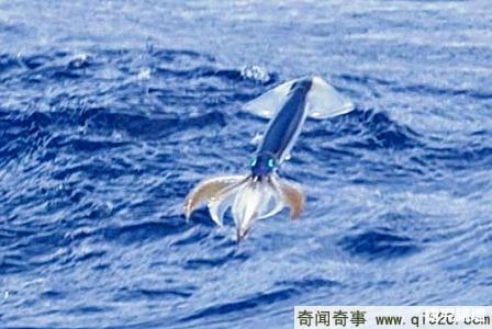據悉,這種特殊的藍色烏賊長八英寸,通常是集體行動,當它們一群群躍出海面時,遠遠看過去,常被誤認為飛魚。這種烏賊“滑翔”的原理是,整個身體“向後”推進,觸鬚在身後擺動,鰭就像飛機翅膀一般保持平衡。
