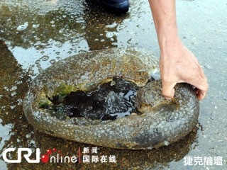 北京時間6月27日消息,浙江省上虞市章鎮鎮的鎮南村發現一恐怖的“醜陋水怪”,它身體在水裡呈現球狀,半透明像果凍,體內還有紅色的血絲,表皮上佈滿許多小孔。更讓人驚訝的是,有好奇的村民將“水怪”放在太陽下曬,發現它竟然像冰棒似的融化。