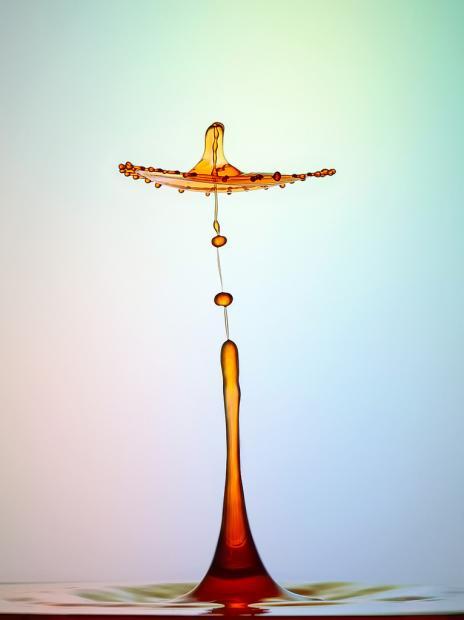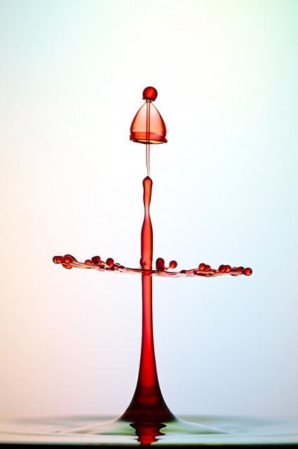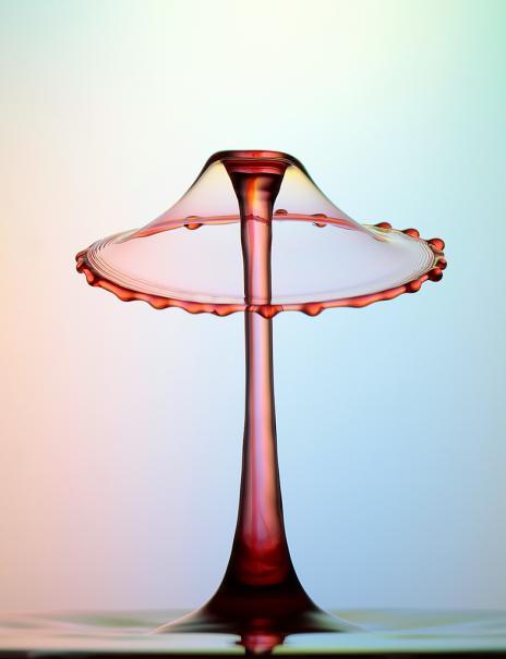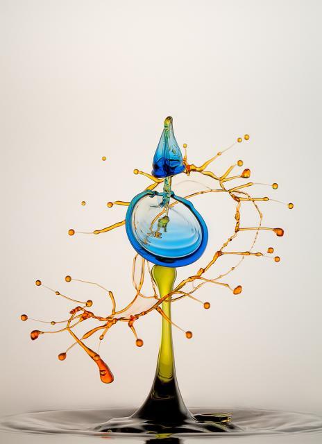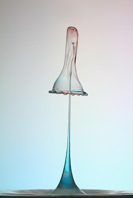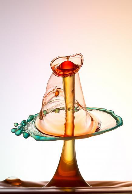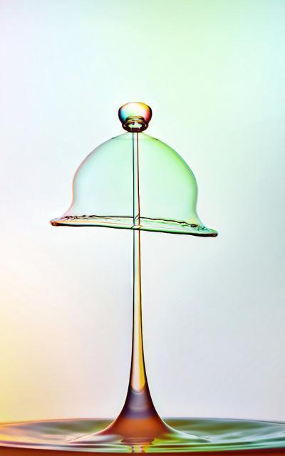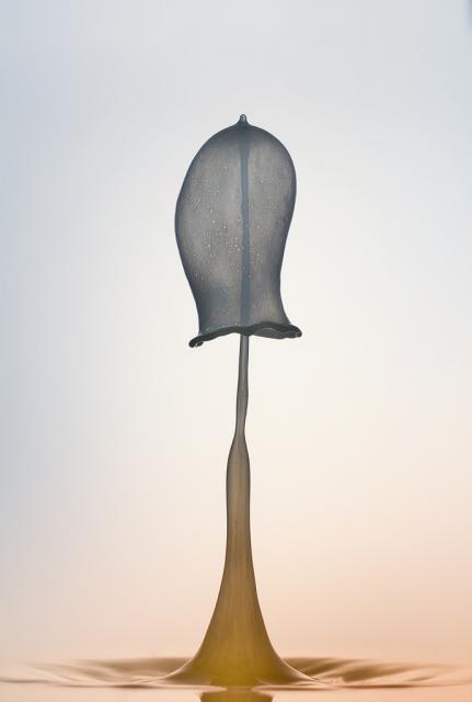 在麦勒的镜头下,水滴呈现出奇异的形态。这幅作品中的水滴好似一个钟,又好似一顶帽子