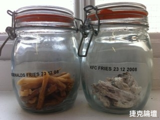 最近國外有網友公開了一項實驗結果,在2008年12月23日購買麥當勞和肯德基的薯條,分別放入玻璃瓶內密封保存,聲稱3年後拿出來一看。結果肯德基的薯條已經發黴腐爛,但是麥當勞的薯條卻仍呈現彷彿剛炸出來的金黃色,這項實驗結果讓不少民眾大為震驚。