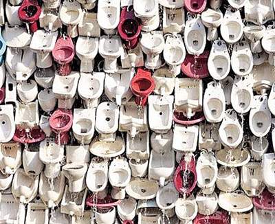 裝飾牆壁可以用各式各樣的磁磚或油漆來美化,但中國藝術家突發奇想,用超過1萬個馬桶拼成一片牆,設計了一個「馬桶瀑布」,非常搶眼。這座馬桶瀑布目前在石灣公園展出,並有全世界乳房最大的「巨乳女郎」在此,讓石灣公園變身為充滿藝術氣息的文化公園。