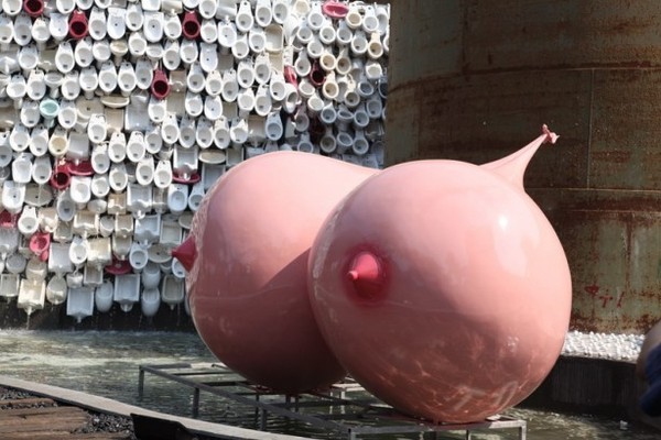 另外,瀑布前的巨乳女郎雕塑也非常引人注目,造型前衛,是由第七屆佛羅倫斯國際當代藝術雙年展終身成就獎的得主舒勇所創作。這個雕塑名為「泡女郎」,以粉紅色乳房造型為主,主要是想是想表達人類的欲望正在無限膨脹,過去曾是北京798藝術區的地標,後來曾遷至清遠牛魚嘴風景區,去年11月因亞洲現代陶藝交流展,才移師佛山。