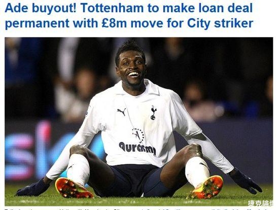 據《每日郵報》報道,托特納姆熱刺已經與曼城開啟談判,以800萬英鎊的報價求購阿德巴約。這名27歲多哥前鋒目前以租借的身份在熱刺效力,本賽季已經為熱刺攻入9球,熱刺主帥雷德克納普希望他能夠以永久轉會的方式加盟熱刺。不過,熱刺難以承擔阿德巴約17萬英鎊的周薪,希望後者能夠降薪加盟;目前,阿德巴約的薪酬支付方式是熱刺與曼城各承擔一半,也就是說,熱刺現在為阿德巴約支付的周薪是8.5萬英鎊。