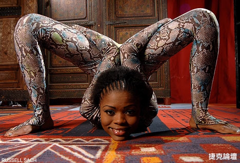 這個神奇少女名叫Nokulunga Buthelezi,在表演時身穿類似蛇皮顔色的服裝,可以將自己的腿掰至下颚,做出各種令觀衆無法相信的動作。據了解,蛇女的身體柔軟是天生的,12歲那年有一天她在睡覺時,她母親走向臥室一看,發現她少了一條腿,原來睡熟之時蛇女竟將腿不由自主地伸到脖子下面了。