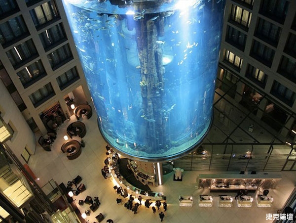 通常到德國旅遊,潛水不是大家心目中的必玩行程,但是如果你下褟的旅館是柏林的Radisson Blu Hotel,或許可以考慮來這邊搭電梯潛水喔!Radisson Blu Hotel擁有世界上最大的圓柱形水族箱Aquadom,水族箱高 82呎,可以容納100萬公升海水,位於飯店大廳中央,由隔壁的Sea Life Berlin Aquarium管理,水族箱內有56種熱帶魚共1500隻,平時由2位專職潛水人員負責餵養。