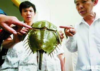 小區撈出這麽個怪東西,引起不少居民趕來看新鮮,一些居民還紛紛拿出手機攝像,並通過彩信發給熟人朋友進行咨詢。不過在場沒一個人見過這種“怪物”。有人猜測這是種海洋生物,但附近卻並沒有任何海鮮餐館。記者上網查閱相關資料后,了解到這“怪物”的名叫鲎(hou),屬節肢動物門,俗稱三刺鲎、兩公婆、海怪,因其長相既像蝦又像蟹,因此人們又稱之爲“馬蹄蟹”是一類與三葉蟲 (現在只有化石)一樣古老的動物。鲎從4億多年前問世至今仍保留其原始而古老的相貌,所以鲎有“活化石”之稱。鲎肉可食用且味道鮮美,更有趣的是,鲎的血液是藍色的,一遇細菌就凝固,因而被廣泛應用于醫療和食品工業,當作檢驗有無細菌的試劑。鲎屬于海洋生物。這只鲎是如何漂洋過海,鑽入這個小區的下水道,在場的人沒人說得清。