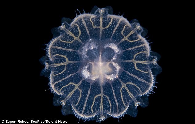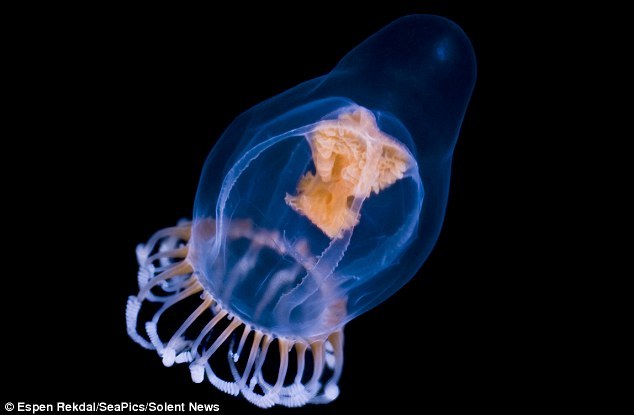 雷克達爾鏡頭中的這些水母都來自挪威的各峽灣水域中。這些美麗的動物身體長度在1厘米到1米之間,它們通常數以百計地聚集在一起。水母在北大西洋海域中較為常見,但是雷克達爾主要拍攝地點位於挪威海域。圖為北大西洋中的桶狀水母,是不透明的,身體呈白色,突出物部分呈紫色或藍色。