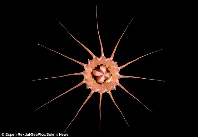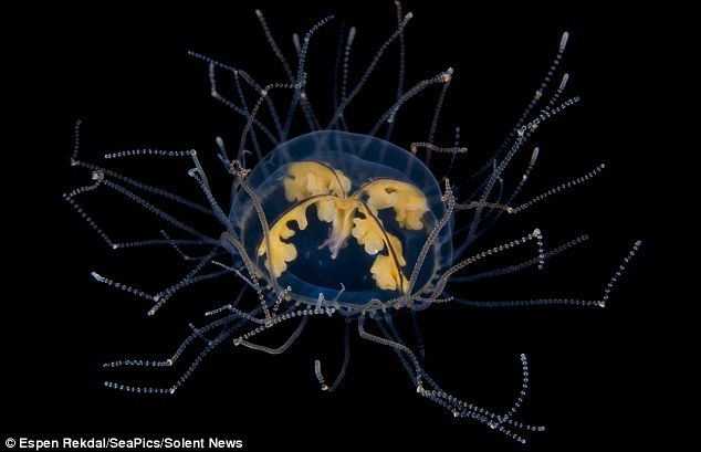 雷克達爾介紹說,「鏡頭中捕捉到的某些深海水母的特別現象,通常只發現於幾個特定的峽灣中。這些水母在深海中分佈廣泛。但是,挪威某些較深峽灣中的水母,它們會在夜間從海底浮出水面捕食。這些水母有些像吸血鬼一樣。」圖上這種怪異的動物是一種水螅水母。