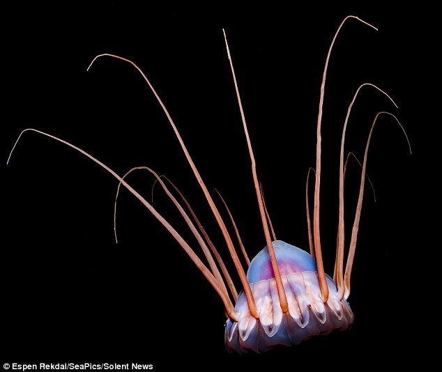 雷克達爾利用一套專用的水下攝影裝備潛入到深海中拍攝到這些震撼的水母照片。他的相機被密封到一個鋁制的防水盒子中,盒子上裝有玻璃舷窗用於拍攝。這只藍色獅鬃水母,它的直徑可達7英尺(約合2.1米),觸鬚可伸展至100英尺(約合30.48米)。