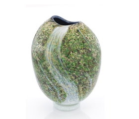 一系列焰畫作品-「鳳凰瀑布」中瀑布水流傾瀉而下,運用吹製玻璃獨特技法,描繪出台灣山脈的翠綠,