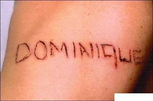 他趁韋恩醉酒熟睡的機會用一把斯坦利刀在他的肩膀上刺上了自己的名字“多米尼克”。