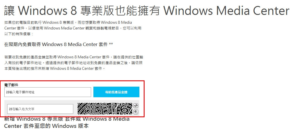 第一步: 首先到網頁連結網址輸入您的電子郵件 申請網址: http://windows.microsoft.com/zh-TW/windows-8/feature-packs