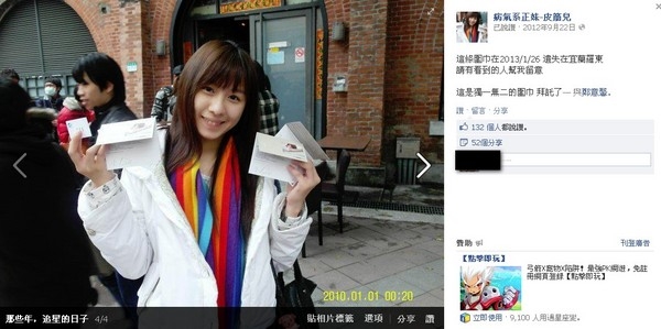 ▲病氣系正妹皮筋兒協尋最愛的彩虹圍巾。(圖/翻攝皮筋兒臉書)