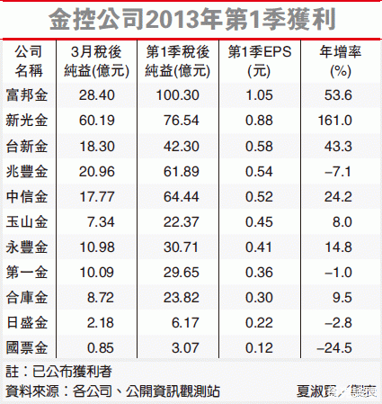 富邦大賺百億 金控公司2013年第1季獲利概況