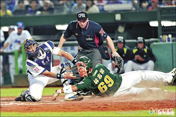 林志祥(右)在二局上靠著張泰山的高飛犧牲打,衝回本壘搶下超前分。(記者廖耀東攝)