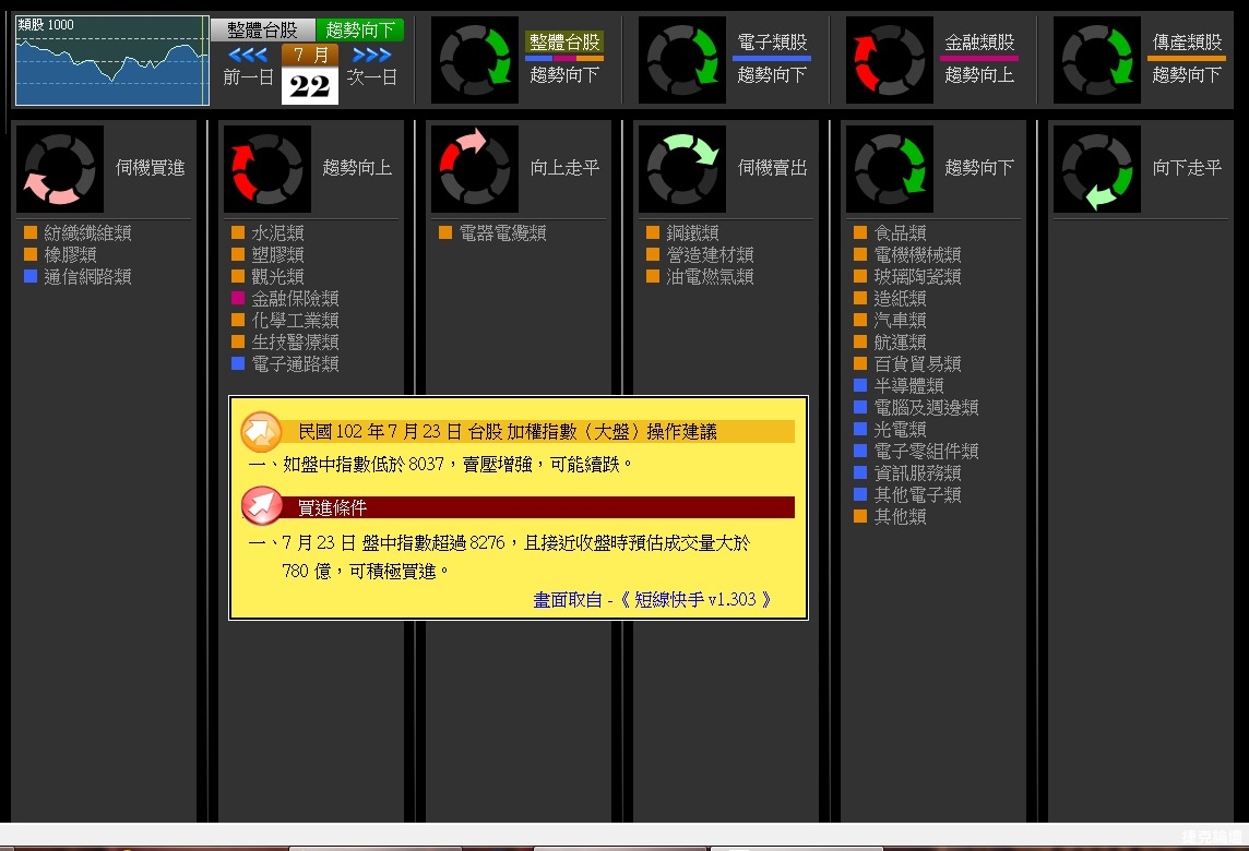 一、7 月 23 日 盤中指數超過 8276,且接近收盤時預估成交量大於 780 億,可積極買進。