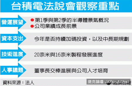 法人認為,台積電要達成今年營收、獲利再創新高的目標,資本支出、20奈米以下先進製程進度是扮演兩大重要關鍵。因此本次法說會,資本支出與技術推進狀況,也是法人聚焦重點。