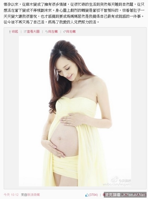吳佩慈留言寫道:「懷孕以來,從麻木變成了擁有很多情緒,從很忙碌的生活到突然每天睡到自然醒,從只想活在當下變成不停規劃未來。身心靈上劇烈的轉變是當初不曾預料的,但看著肚子一天天變大讓我很喜悅,也才感覺到要成爲媽媽居然是我覺得自己最有成就感的一件事。」透露出為人母的心情轉變,幸福心情表露無遺。