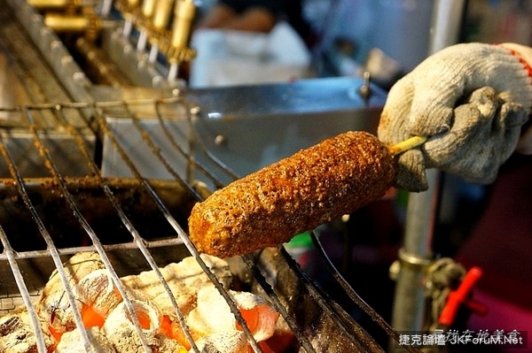 早期是用手不停地將玉米轉動,讓玉米均勻受熱,現在有了自動轉烤爐,老闆不用這麼辛苦,玉米正在享受紅通通地碳火日光浴,一層又一層的醬汁慢慢的涮上去。