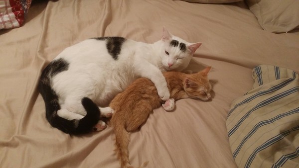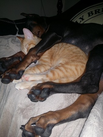 養了第一隻寵物,很容易就接二連三的養下去。國外有一名貓主人也是如此,家中養了貓咪之後,後來又救援了一隻橘小貓回家,沒想到家裡的大貓心胸超開闊,馬上就和小貓變成好朋友,抱著牠一起睡覺。幸運的橘小貓不只小時候有大貓呵護,長大後,家裡的杜賓犬也很照顧牠,會抱著一起休息,從此過著幸福的生活。 主人把橘小貓救援回家之後,就外出吃飯,後來返家時,就看到家裡的大貓伸手攬著牠,正在一起休息,畫面相當溫馨。隨著小貓越長越大,身邊的守護者也從大貓變成杜賓犬,經常抱著睡覺。而許多網友看到之後,也都覺得很甜美,紛紛轉發分享。