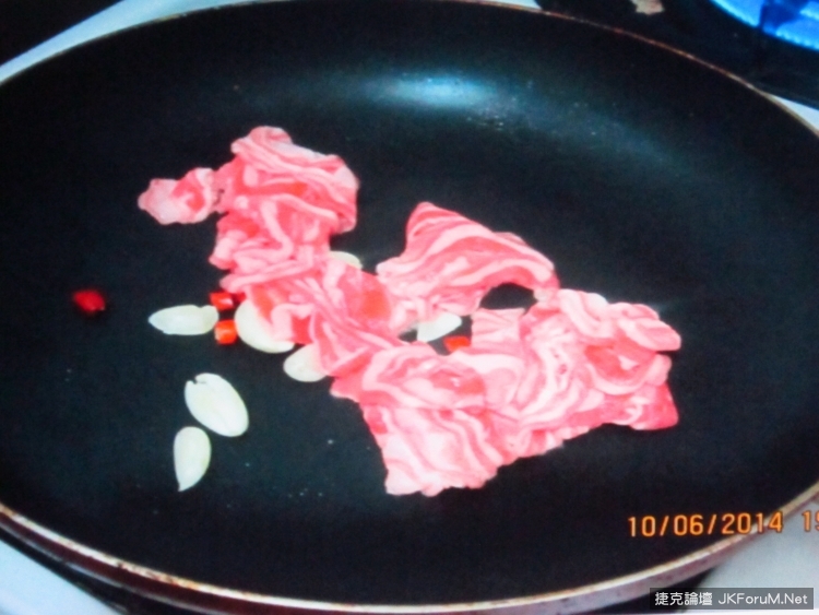 4.放入一小湯匙沙拉油,等油微熱,將切好的辣椒與蒜頭放入爆香