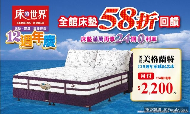 床的世界12週年慶,在全民齊力對抗油電雙漲的同時,盛大祭出「全館床墊58折」感恩回饋活動,受到一致好評。同時這次週年慶更推出「24期分期0利率」活動,只要在活動期間床墊消費滿萬元以上即可享分期0利率優惠!千萬不要錯過囉!