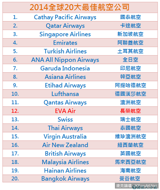 作為航空界最具公信力及知名的Skytrax,是一家在英國以航空服務調查為主的機構,每年主要透過國際旅客的問卷調查作統計分析並獲得各種獎項排名。根據2013年8月~2014年5月間針對世界各航空公司所做的統計分析,超過105個國家、245間航空公司及1,885萬國際旅客的問卷調查,並涵蓋一般航空公司及低成本航空公司的全方位服務品質等41項各項重點調查,以獲得2014年度全球20大最佳航空公司。